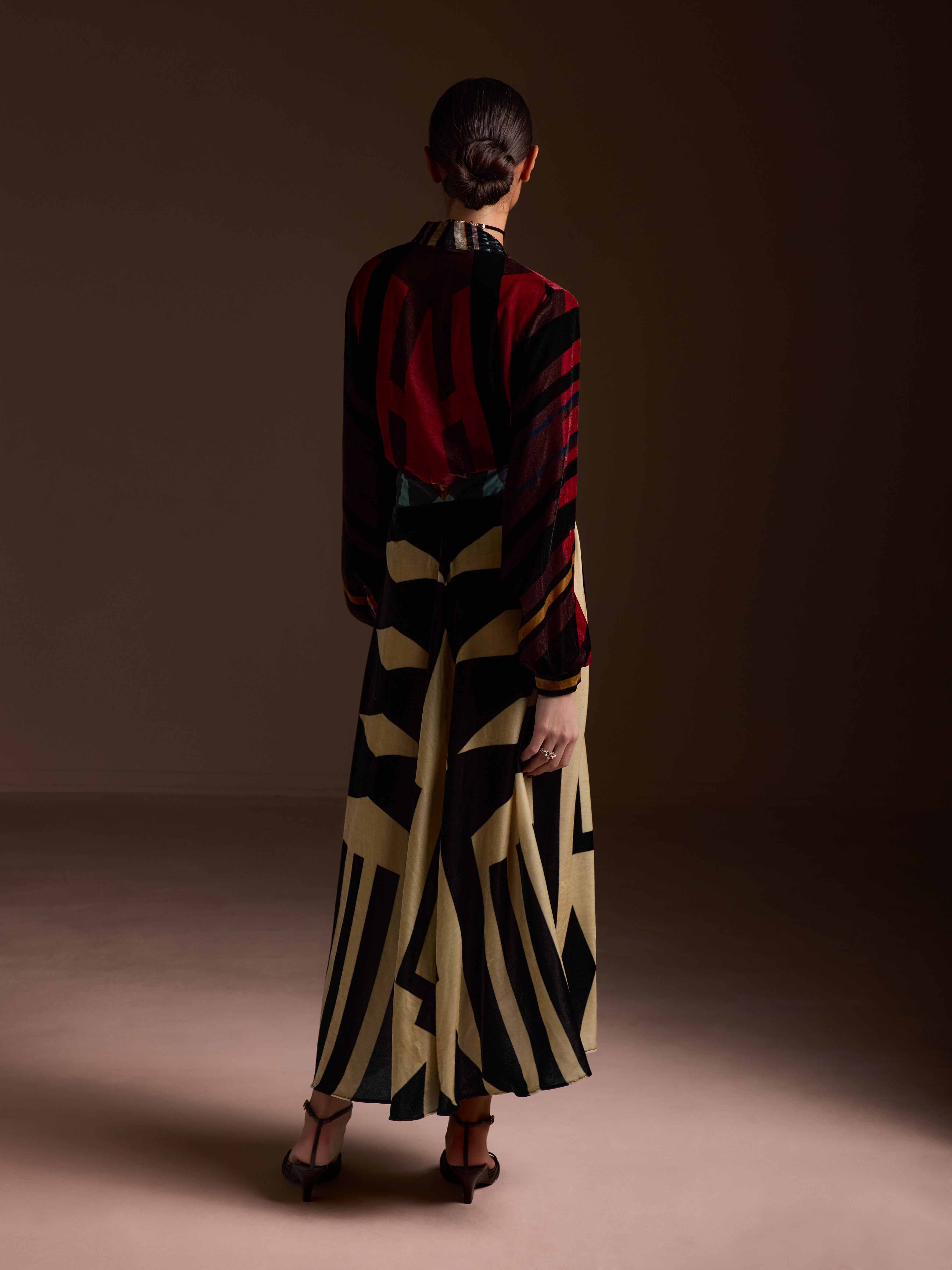 The caravana dress is a silk velvet dress with long sleeves, a V neckline, and a fitted waist. The Caravan Dress flows full-length with ease — graceful, flattering.
