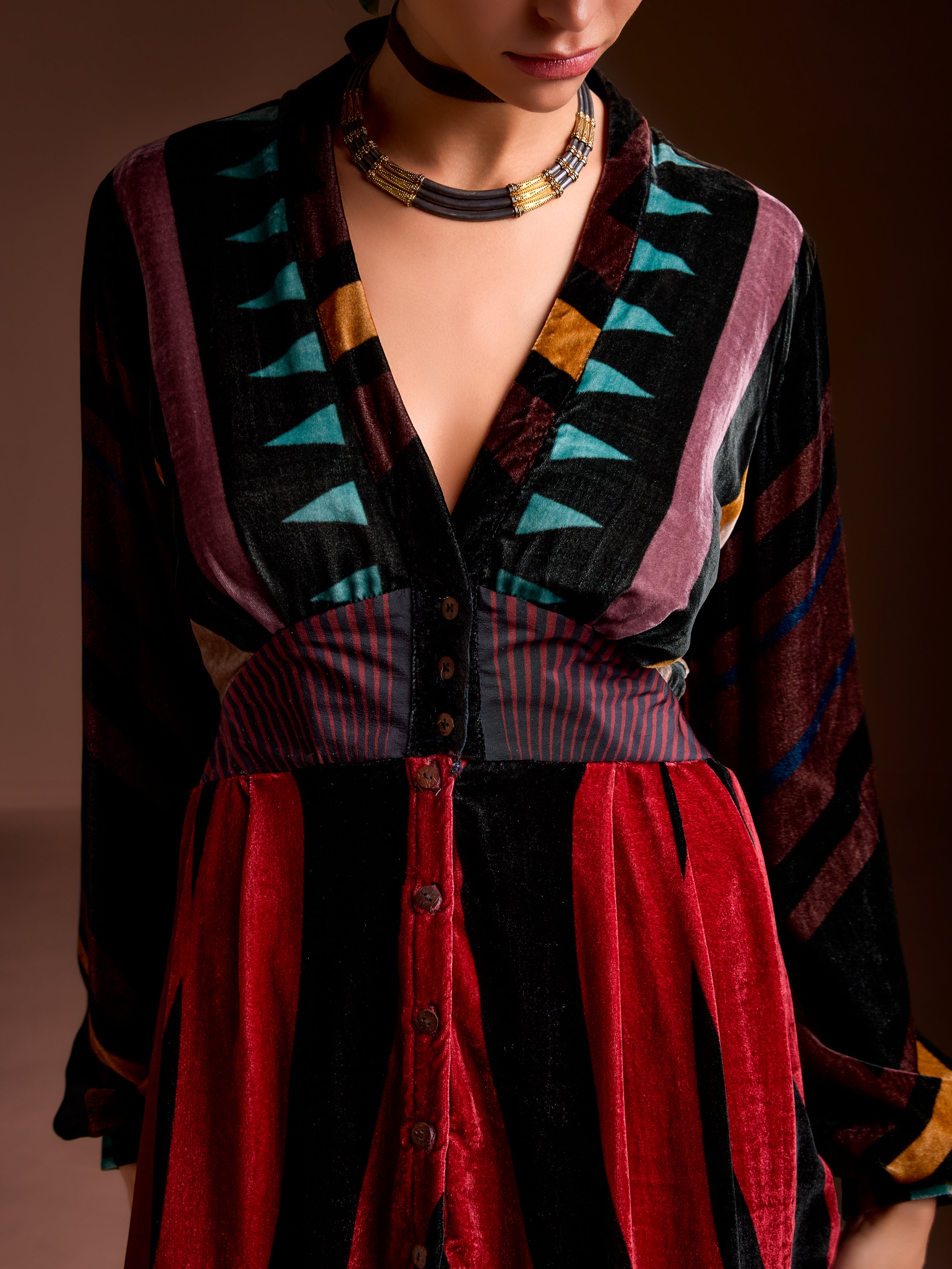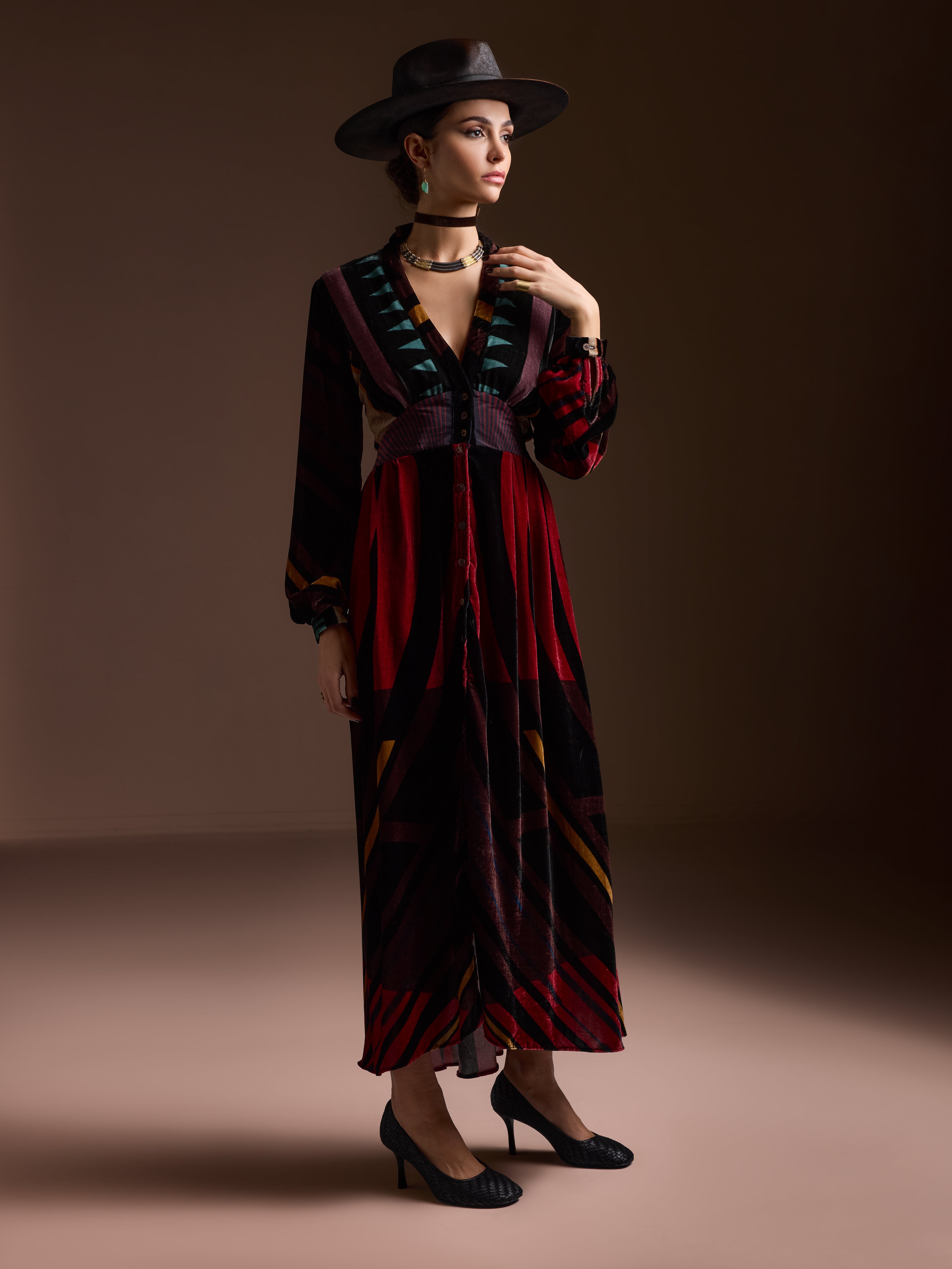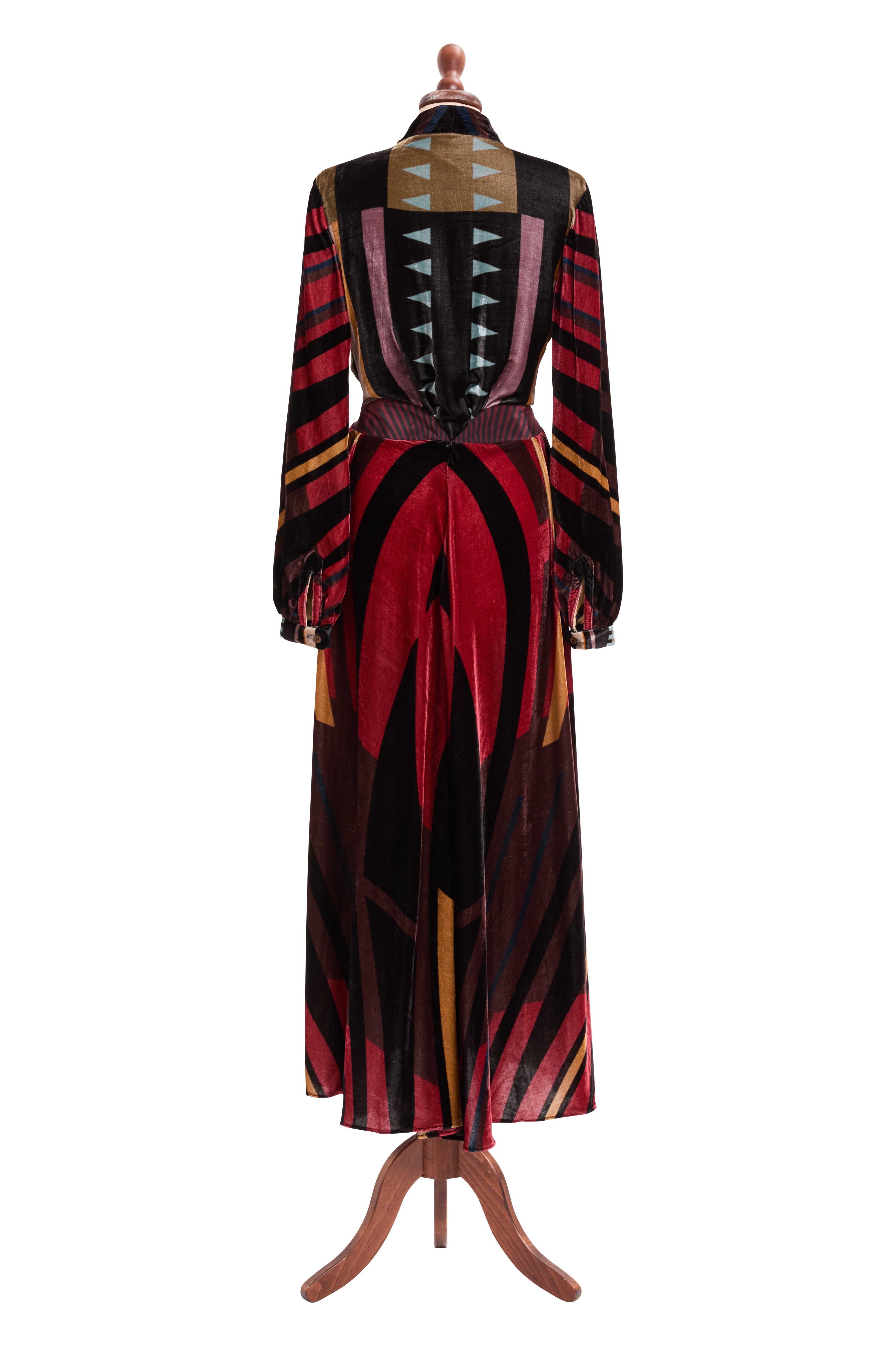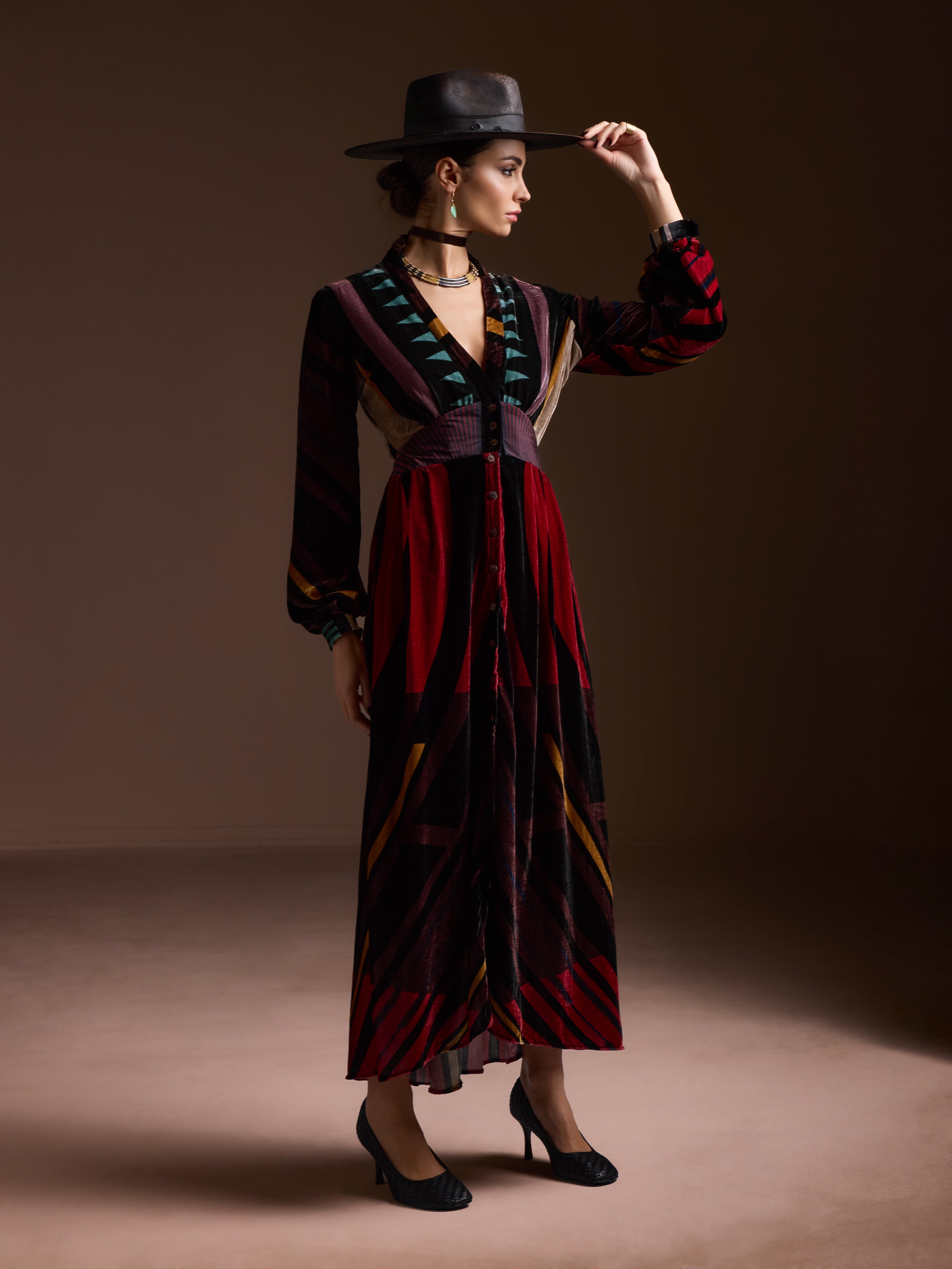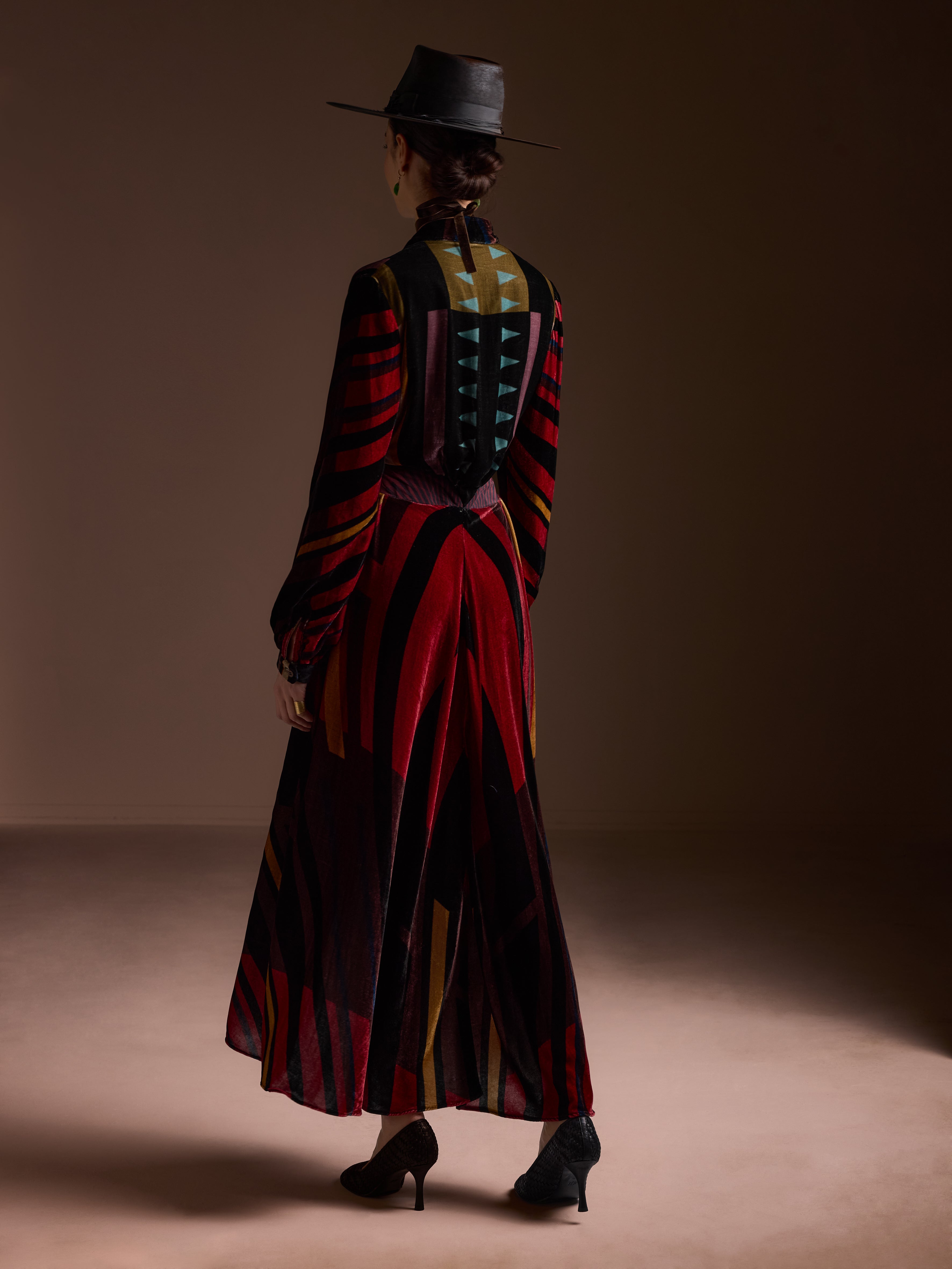 The caravana dress is a silk velvet dress with long sleeves, a V neckline, and a fitted waist. The Caravan Dress flows full-length with ease — graceful, flattering.