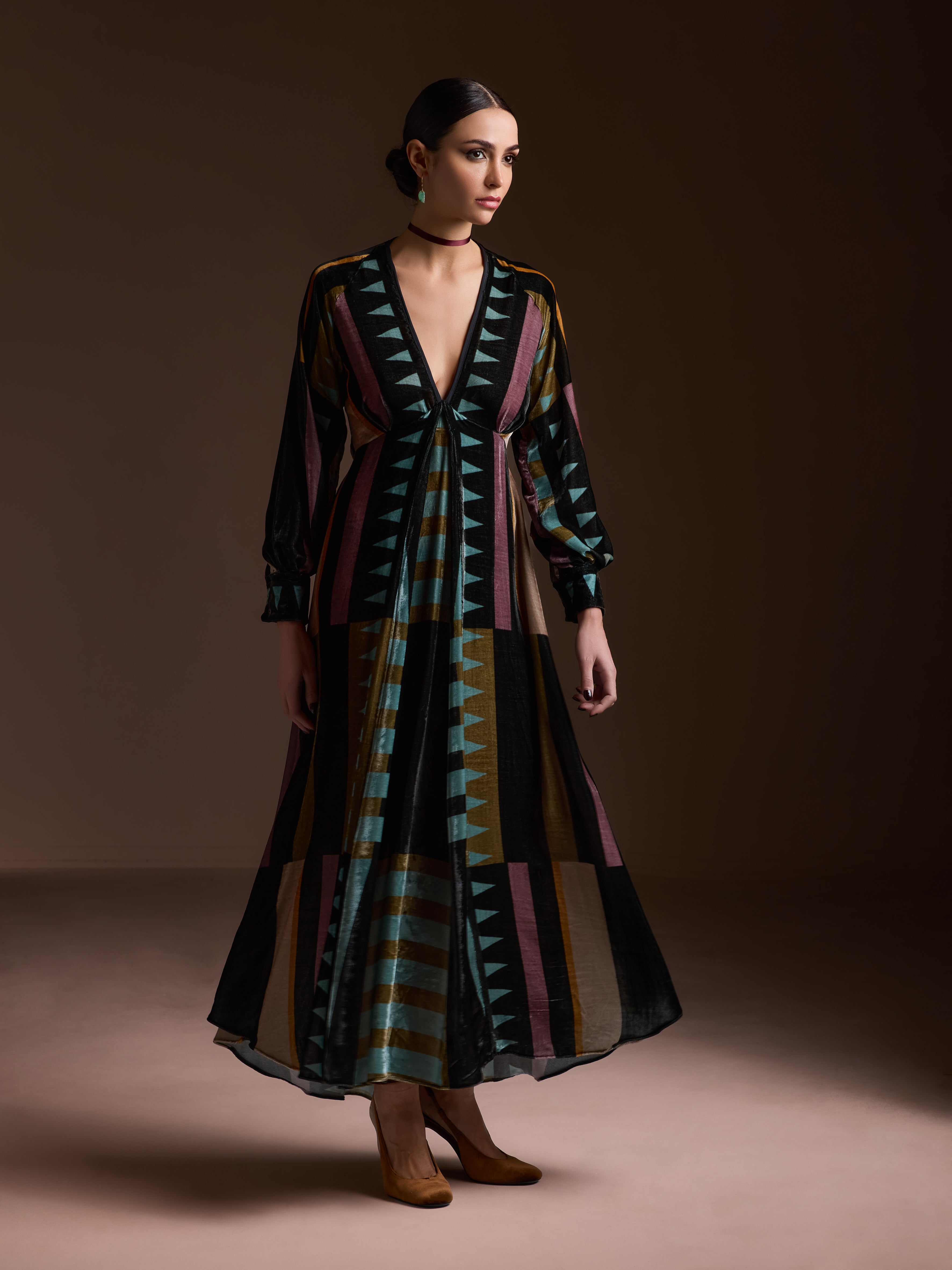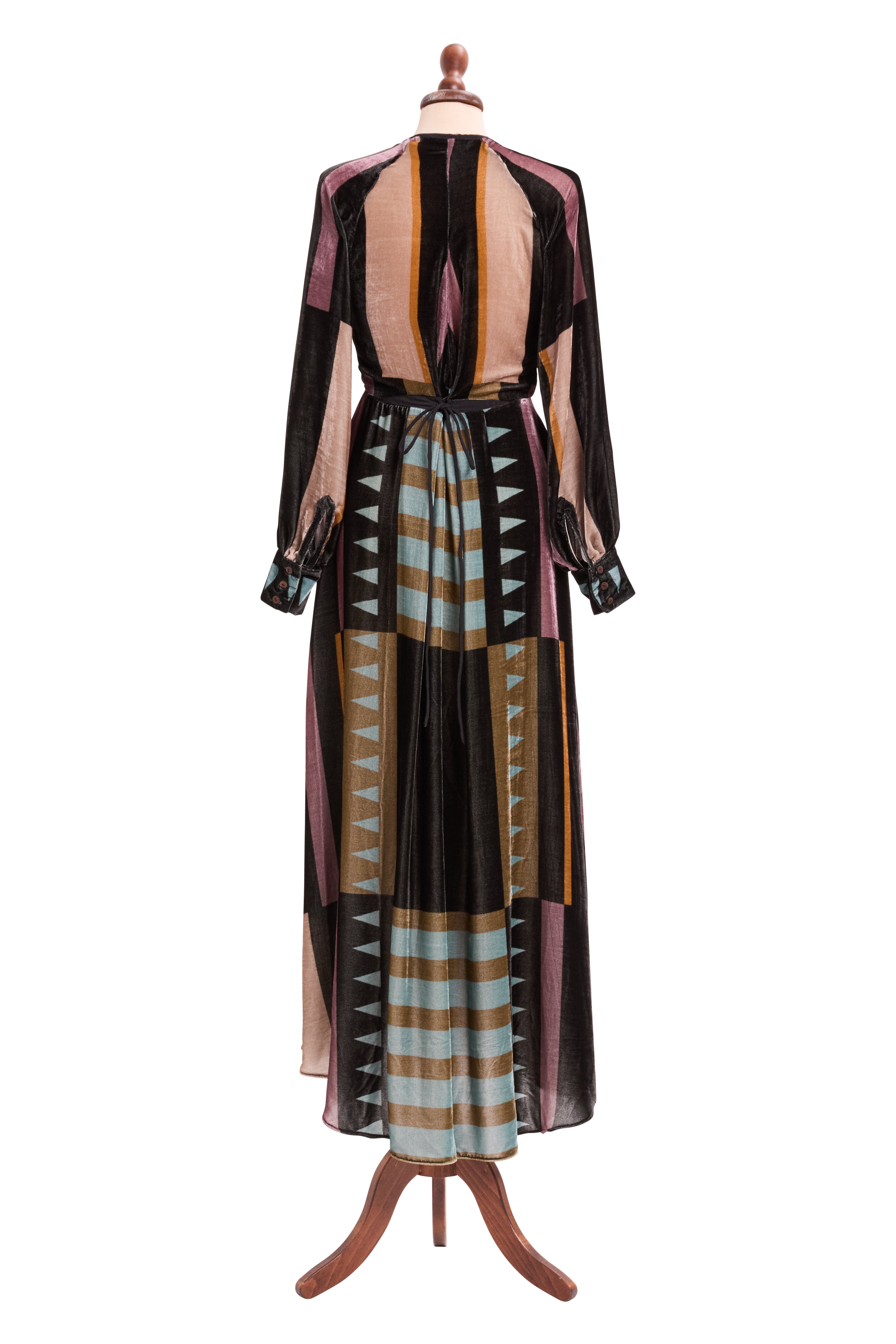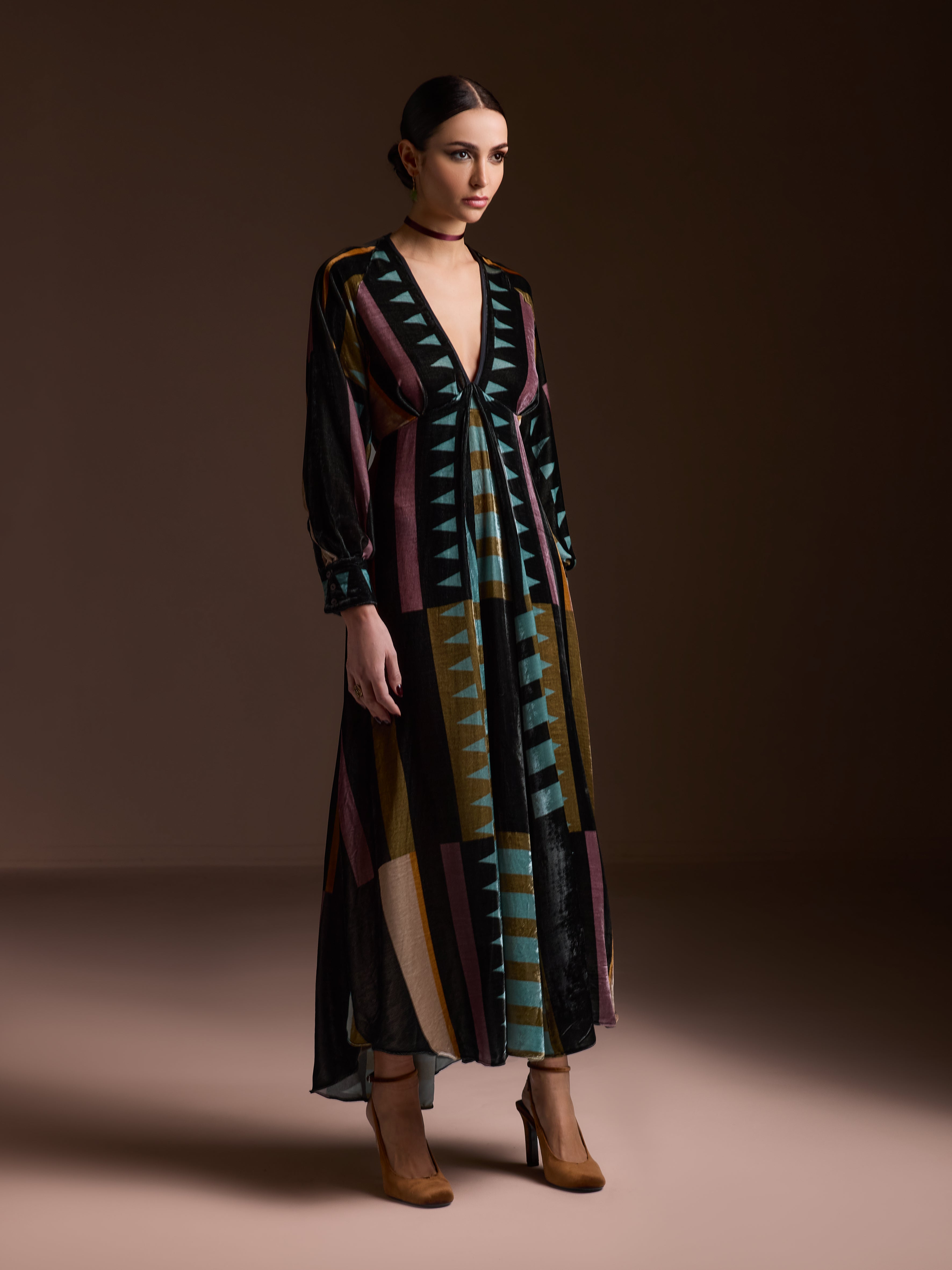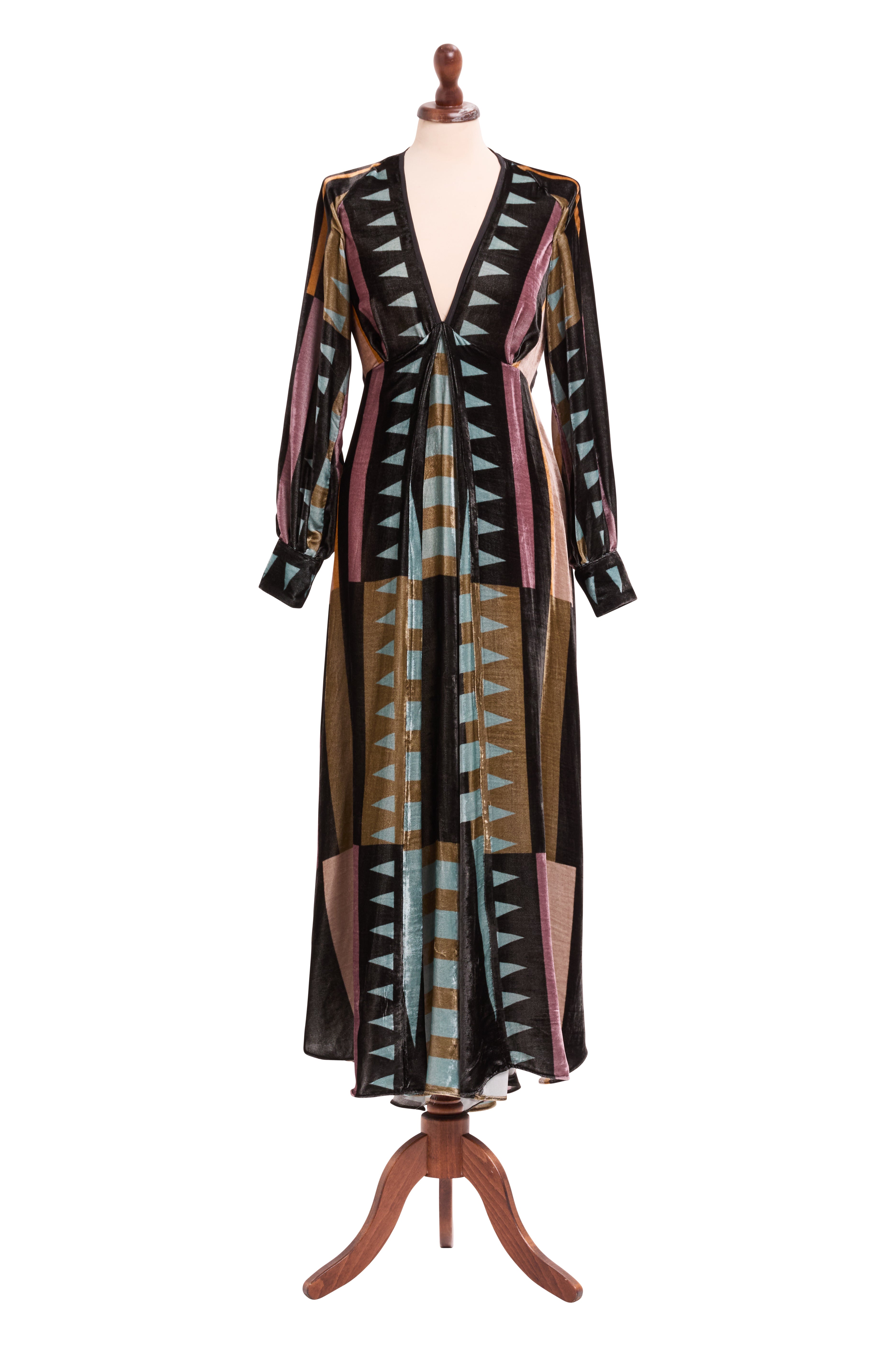 The Illumination Dress is a vision of quiet radiance — crafted from silk velvet in a luxurious blend of 80% viscose and 20% silk. Its fluid texture catches the light with a subtle glow, wrapping the body in warmth and elegance. Designed for winter soirées and grand occasions, this full-length silhouette elongates the figure with grace, while a deep V neckline and long sleeves evoke timeless allure.
