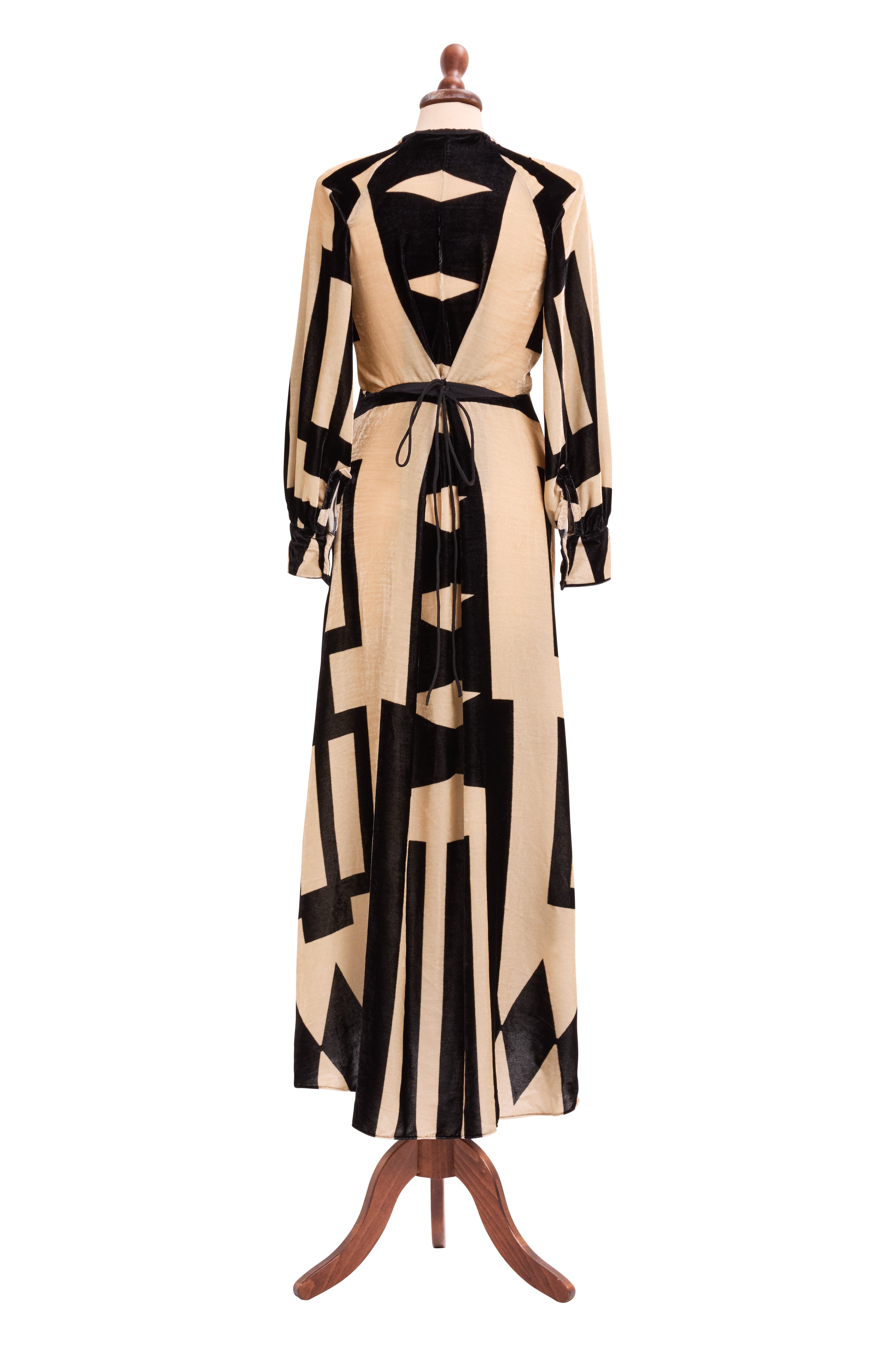 The Illumination Dress is a vision of quiet radiance — crafted from silk velvet in a luxurious blend of 80% viscose and 20% silk. Its fluid texture catches the light with a subtle glow, wrapping the body in warmth and elegance. Designed for winter soirées and grand occasions, this full-length silhouette elongates the figure with effortless grace, while a deep V neckline and long sleeves evoke timeless allure.