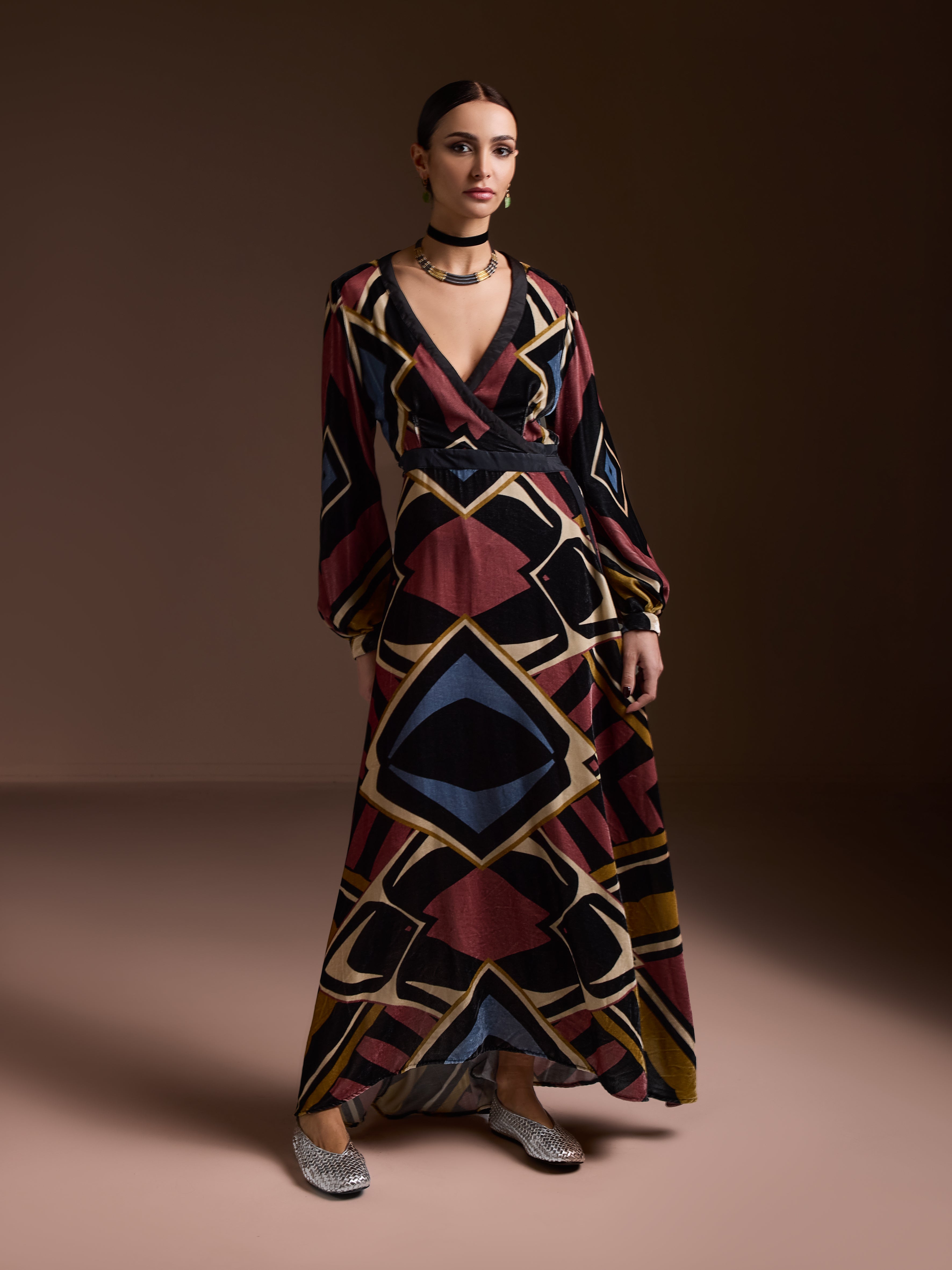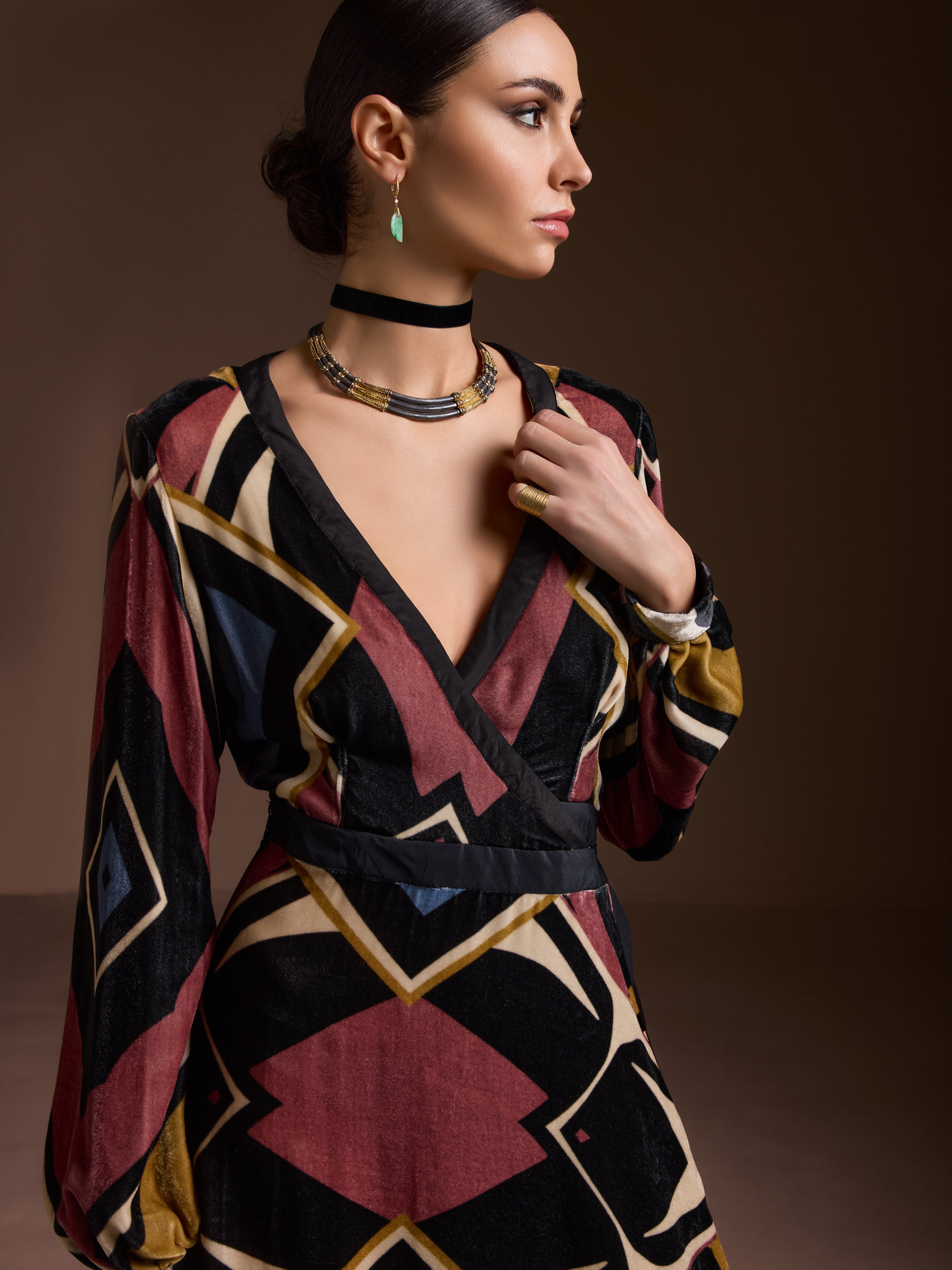 The Mojave Dress — cut in silk velvet that glows like desert dusk. A full-length wrap that moves with quiet confidence, tracing the body in soft fluidity. Its fit — a gentle embrace, from S to M — speaks of ease and understated allure. A dress for evenings that linger, and moments that ask for nothing but presence.