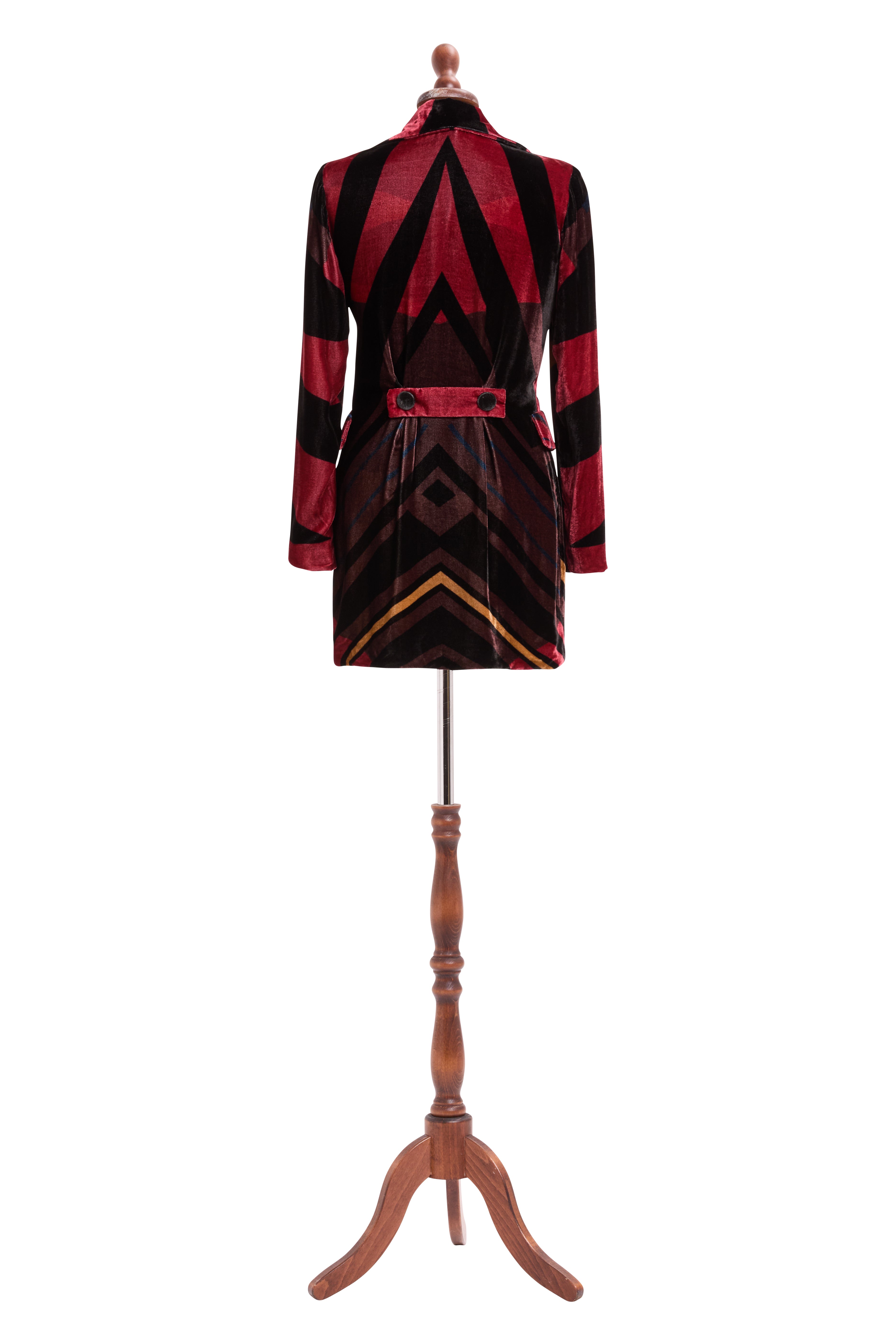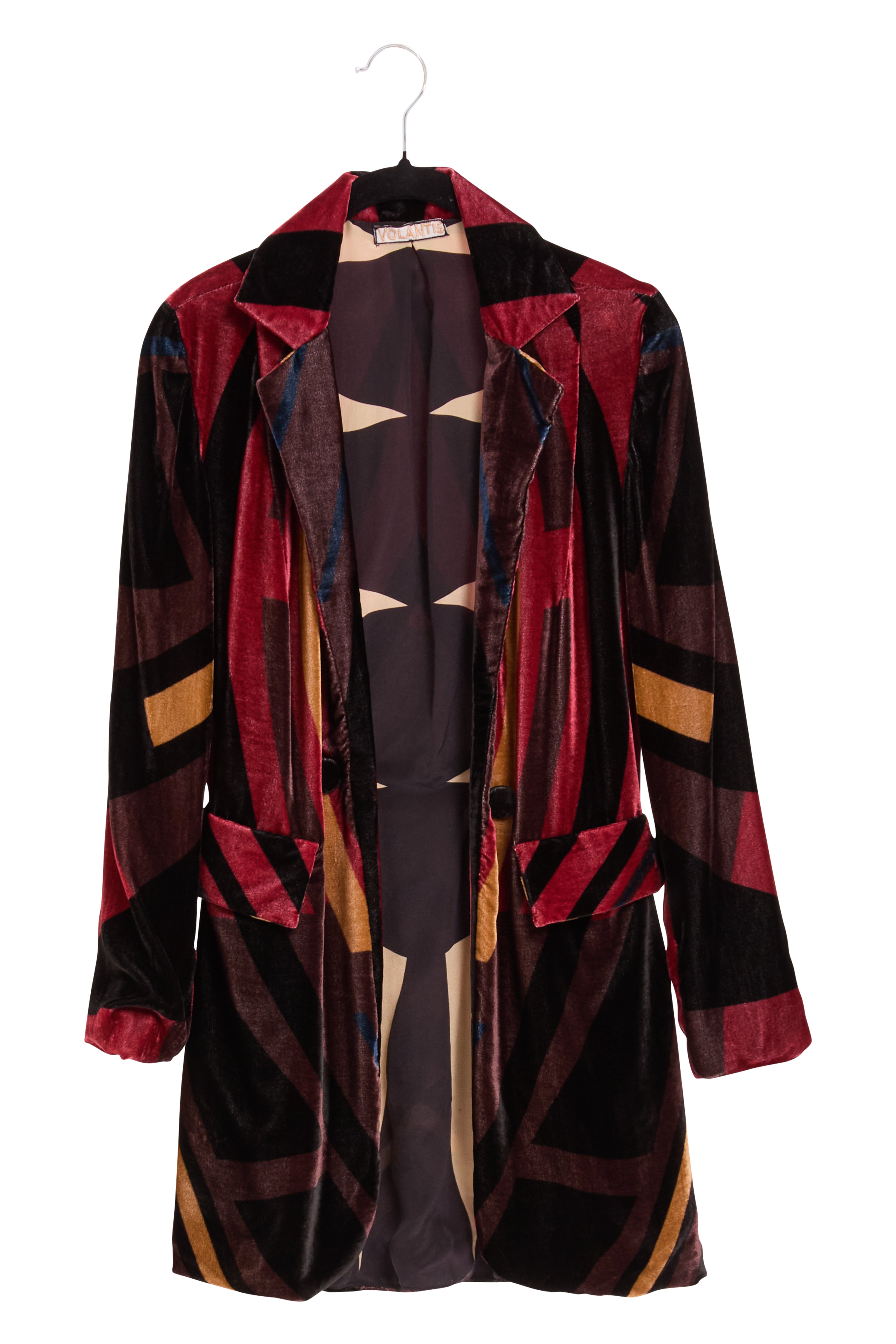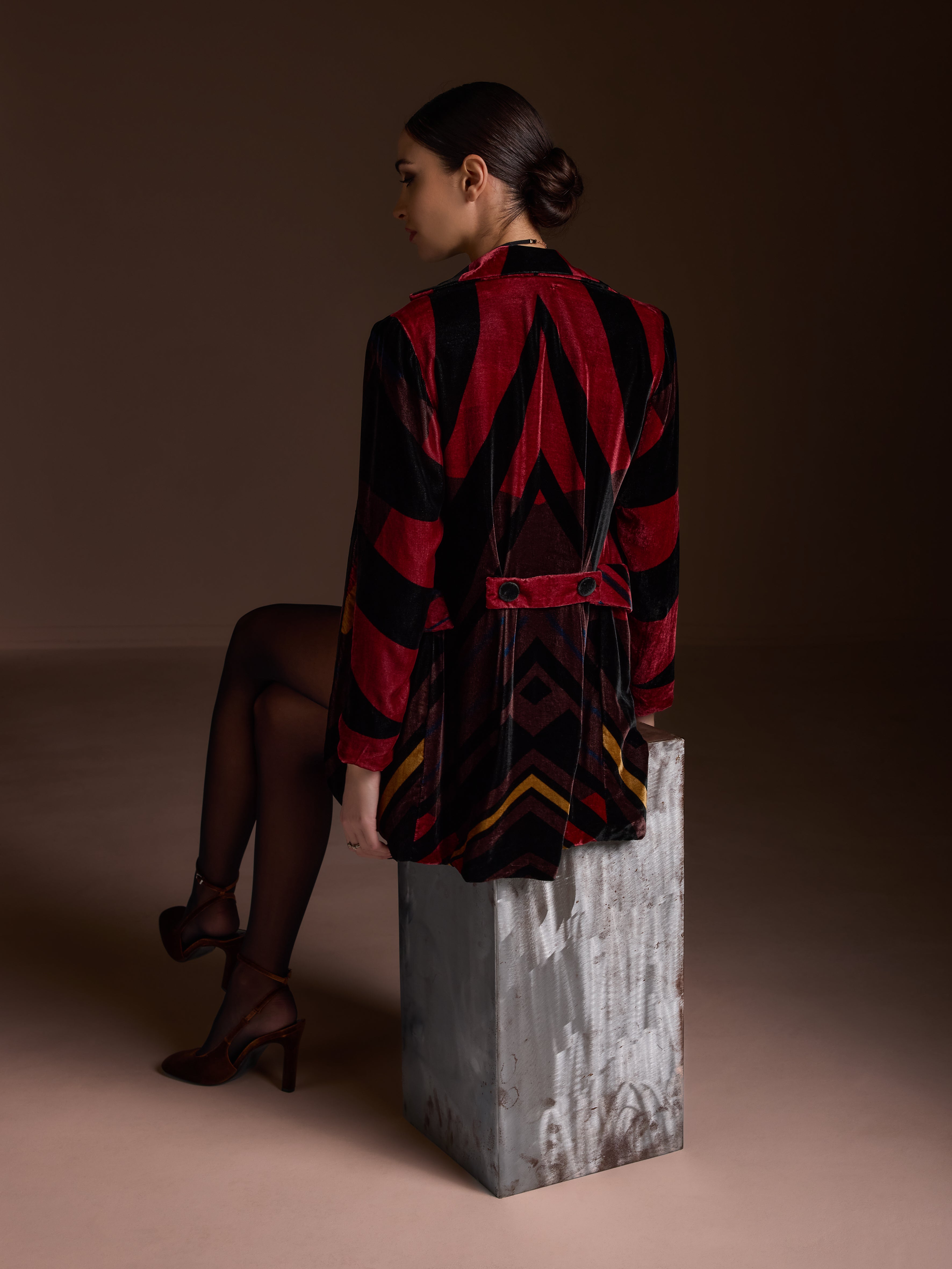 The Palms Jacket is crafted in silk velvet, tailored to a structured yet relaxed silhouette. Featuring a single-breasted front with one button closure, two side pockets, and an elongated back, it combines precision with softness — a timeless layer for modern refinement.