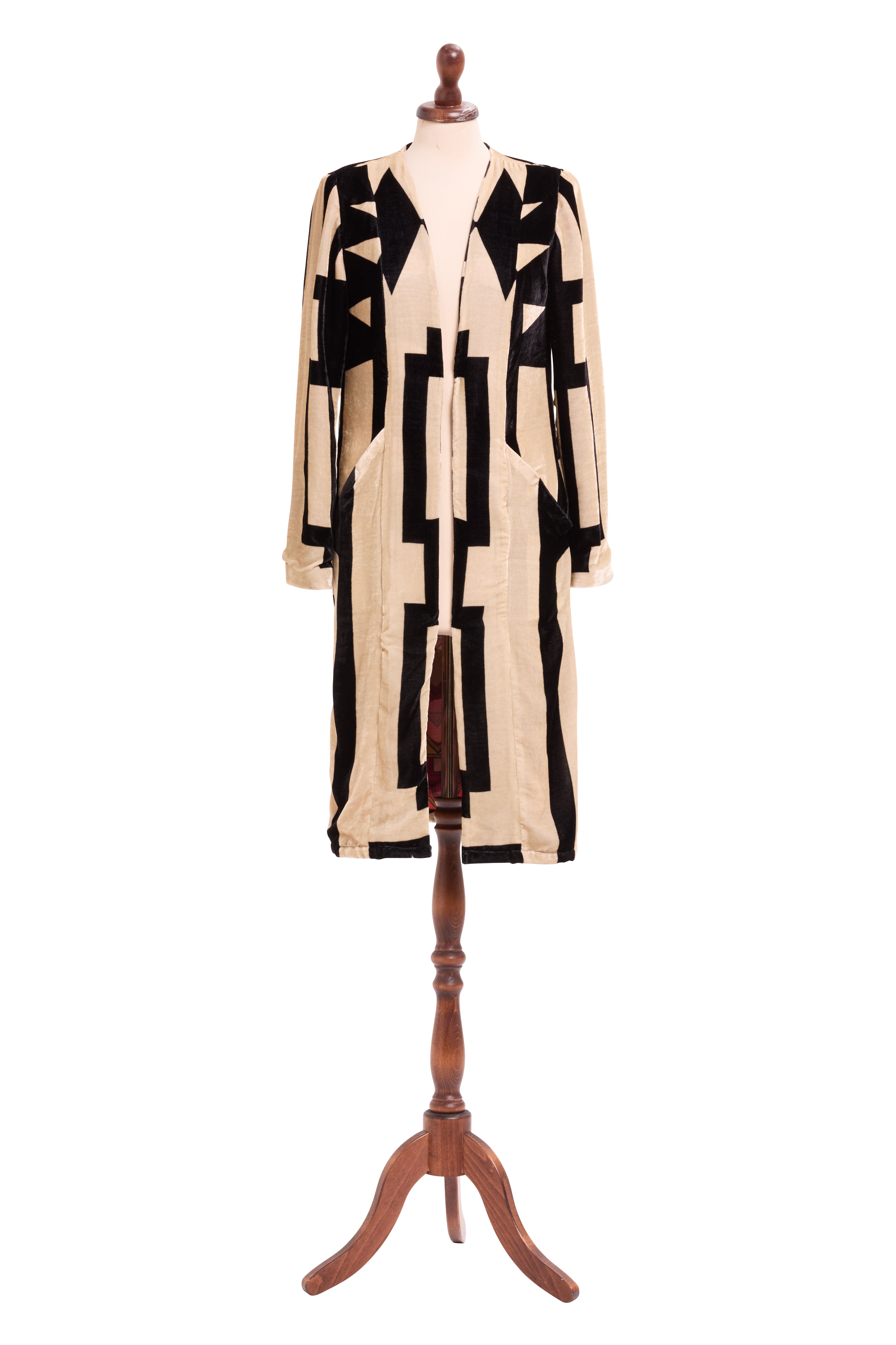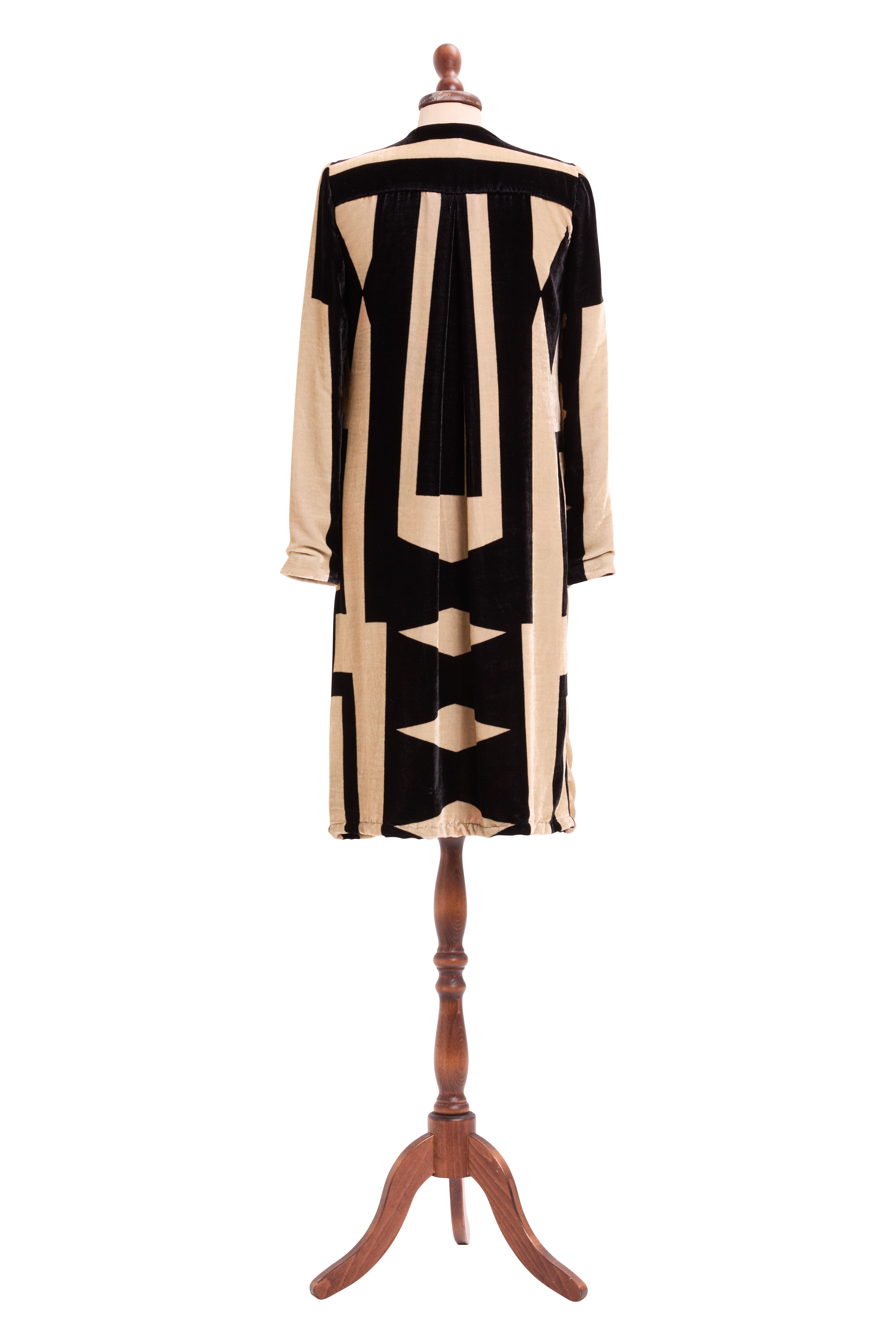 A structured silk velvet coat lined in printed Volantis silk. The Shield Coat features a slim, tailored fit with pockets and clean lines — refined yet assertive, designed for mid-season days in the city.